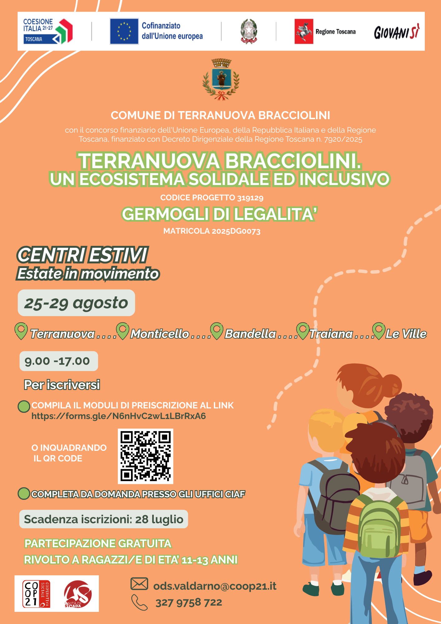 CENTRI ESTIVI Estate in Movimento 🗓️dal 25 al 29 agosto 🕐 dalle 9.00 alle 17.00 🧑🤝🧑 ragazzi/e di 11-13 anni Terranuova..Monticello….Bandella….Traiana ..Ville Per info e iscrizioni Compila il modulo di preiscrizione Completa la domanda presso gli uffici ciafScadenza iscrizioni 28 luglioPer info e contattiods.valdarno@coop21.it Iniziativa realizzata all’interno del progetto “Terranuova Bracciolini. Un ecosistema solidale ed inclusivo” del Comune di […]